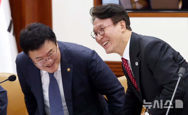 [서울=뉴시스] 추상철 기자 = 김민석 국무총리가 24일 오후 서울 종로구 정부서울청사에서 열린 국정현안관계장관회의에 참석하며 김대현 문화체육관광부 제2차관과 인사하고 있다. 2025.09.24. [email protected]