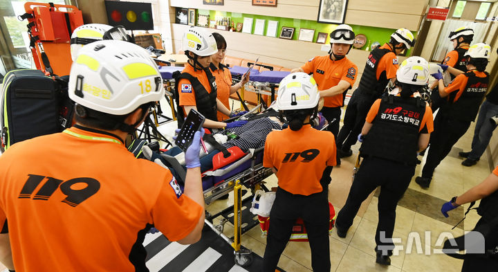 [용인=뉴시스] 김종택 기자 = 24일 경기 용인시 남사면 경기도 소방학교에서 열린 구급 출동 종합시뮬레이션(LETS:렛츠)에 참가한 소방학교 신임교육생들이 중증외상,심뇌혈관 질환 등 실제 응급상황을 가정한 구급교육 훈련을 하고 있다. 2025.09.24. [email protected]