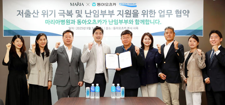 [서울=뉴시스] 임태원 마리아병원 재단장이 24일 서울 동대문구 동아오츠카 서울사무소에서 동아오츠카와 ‘저출산 극복 및 난임부부 지원’을 위한 업무협약(MOU)을 체결한 후 참석자들과 기념촬영을 하고 있다. 이날 협약식에는 임태원 마리아병원 재단장, 박철호 동아오츠카 대표이사 사장을 비롯한 양측 주요 관계자들이 참석했다. 이번 협약을 통해 마리아병원은 동아오츠카로부터 물류 지원을 받아 전국 10개 본원 및 분원에서 시술을 받는 난임부부를 대상으로 이온음료 ‘포카리스웨트 이온워터’를 제공한다. (사진=마리아병원 제공) 2025.09.24. [email protected]