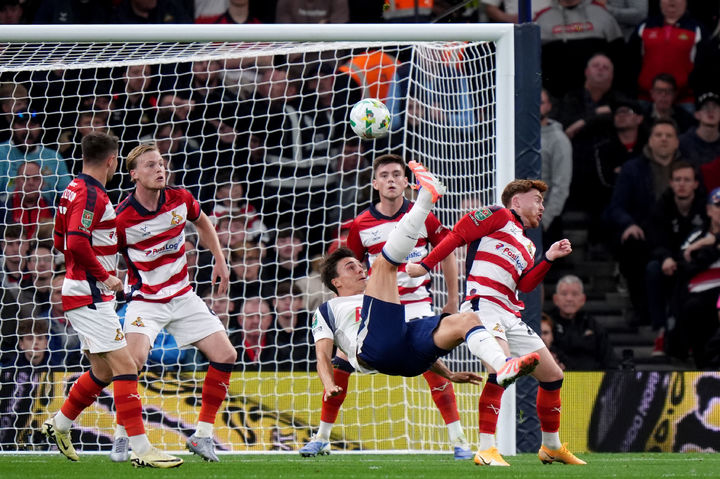 [런던=AP/뉴시스] 토트넘 홋스퍼의 주앙 팔리냐(앞)가 24일(현지 시간) 영국 런던 토트넘 홋스퍼 스타디움에서 열린 2025-26 카라바오컵(리그컵) 3라운드 동커스터 로버스(3부 리그)와의 경기 전반 14분 오버헤드킥으로 선제골을 넣고 있다. 토트넘이 3-0으로 완승하고 16강에 올랐다. 2025.09.25.