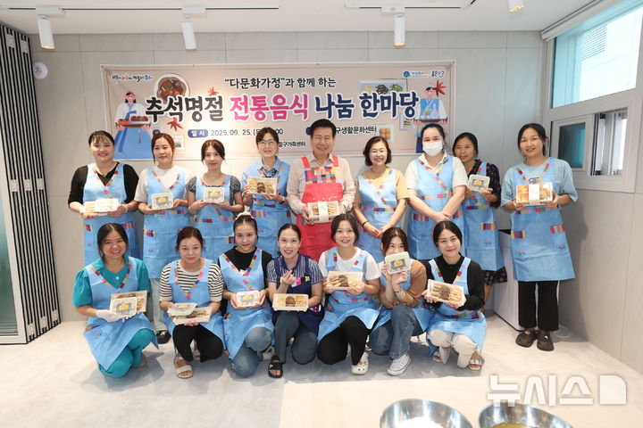 [대구=뉴시스] 이상제 기자 = 25일 대구 중구생활문화센터 5층 공유부엌에서 열린 '다문화가정과 함께하는 추석명절 전통음식 나눔 한마당' 행사에서 류규하 중구청장과 다문화가족들이 기념 촬영을 하고 있다. 2025.09.25. [email protected]