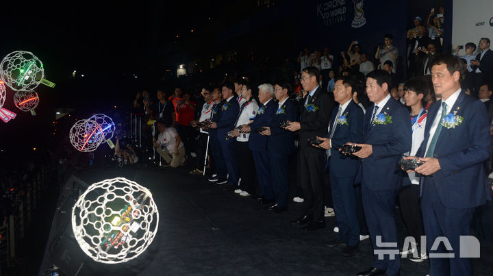 [전주=뉴시스] 김얼 기자 = 2025 전주드론축구 월드컵 개막식이 열린 25일 전북 전주시 전주월드컵경기장에서 내빈들이 개막 퍼포먼스를 하고 있다. 2025.09.25. [email protected]