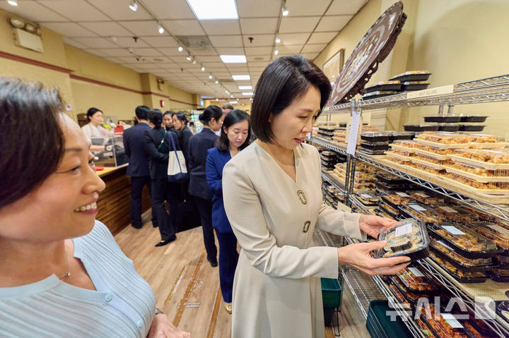 [뉴욕=뉴시스] 최동준 기자 = 김혜경 여사가 23일(현지 시간) 미국 뉴욕 코리아타운 한 마트를 방문해 김밥을 살펴보고 있다. (공동취재) 2025.09.25. [email protected]