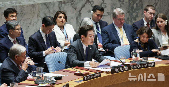 [뉴욕=뉴시스] 최동준 기자 = 이재명 대통령이 24일(현지 시간) 미국 뉴욕 유엔본부에서 열린 안전보장이사회에서 의장 자격으로 공개 토의를 주재하며 국별발언을 하고 있다. 2025.09.25. [email protected]