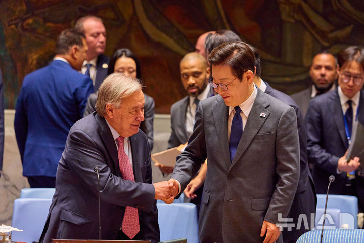 [뉴욕=뉴시스] 최동준 기자 = 이재명 대통령이 24일(현지 시간) 미국 뉴욕 유엔본부에서 열린 안전보장이사회에서 의장 자격으로 공개 토의 주재에 앞서 안토니우 구테흐스 유엔 사무총장과 인사하고 있다. (공동취재) 2025.09.25. [email protected]