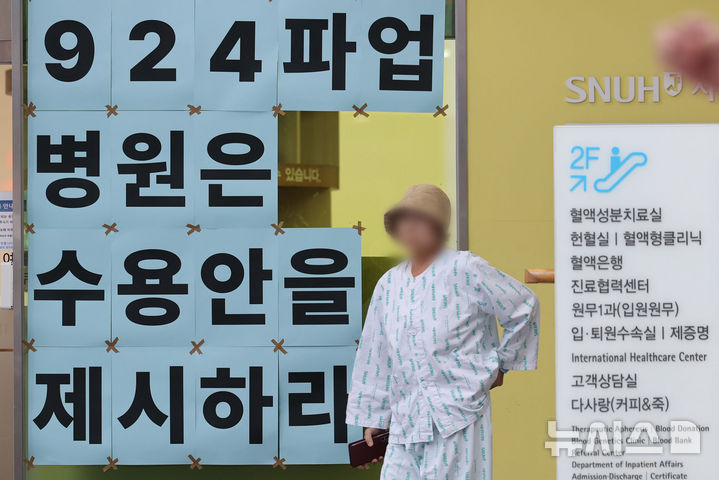 [서울=뉴시스] 권창회 기자 = 서울대학교 병원 노조의 전면 무기한 파업 이틀째인 25일 오전 서울 종로구 서울대병원에 파업 관련 문구가 붙어있다. 2025.09.25. [email protected]