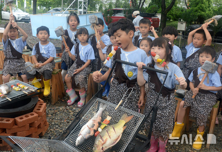 [완주=뉴시스] 김얼 기자 = 제13회 완주와일드&로컬푸드축제를 하루 앞두고 사전행사가 열린 25일 전북 완주군 고산자연휴양림 완주와일드&로컬푸드축제 화덕존에서 어린이들이 생선과 꼬치를 구우며 사전행사를 즐기고 있다. 2025.09.25. [email protected]