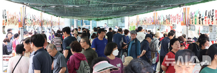 [인천=뉴시스] 전진환 기자 = 추석을 앞두고 옹진'섬'농수특산물직거래장터가 열린 25일 인천 미추홀구 옹진군청 앞에서 시민들이 장을 보고 있다. 2025.09.25. [email protected]