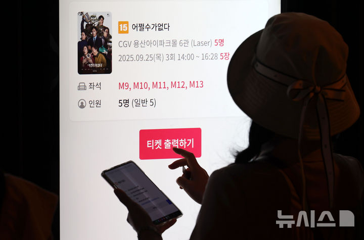 [서울=뉴시스] 홍효식 기자 = 영화 '어쩔수가없다'가 공개 첫 날 33만명이 넘는 관객을 끌어 모으며 박스오피스 정상에 오른 가운데 25일 서울 시내 한 영화관에서 한 관객이 '어쩔수가없다' 티켓을 출력하고 있다.