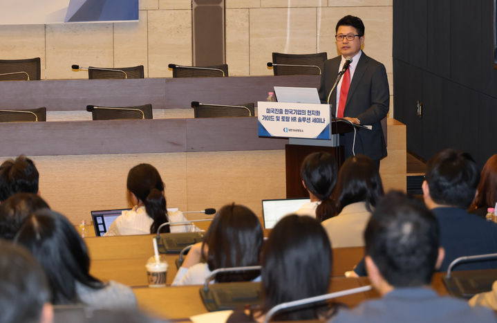 [서울=뉴시스] 김성수 HRCap 대표가 25일 서울 중구 대한상의 의원회의실에서 열린 미국진출 한국기업의 현지화 가이드 및 토탈 HR 솔루션 세미나에 참석해 '미국 조지아 사태 - 원인 분석 및 대응 솔루션'이라는 주제로 발표하고 있다. (사진=대한상공회의소 제공) 2025.09.25. [email protected] *재판매 및 DB 금지