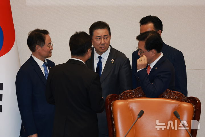 [서울=뉴시스] 고승민 기자 = 우원식 국회의장과 김병기, 송언석 등 여야 원내지도부가 25일 서울 여의도 국회에서 열린 제429회 국회(정기회) 제9차 본회의에서 법안 투표 중 발생한 투표지와 명패 갯수 1개차 오류에 대해 논의하고 있다. 2025.09.25. [email protected]