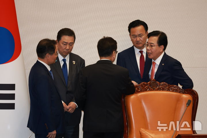 [서울=뉴시스] 고승민 기자 = 우원식 국회의장과 김병기, 송언석 등 여야 원내지도부가 25일 서울 여의도 국회에서 열린 제429회 국회(정기회) 제9차 본회의에서 법안 투표 중 발생한 투표지와 명패 갯수 1개차 오류에 대해 논의하고 있다. 2025.09.25. [email protected]