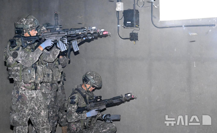 [인제=뉴시스] 사진공동취재단 = 25일 강원도 인제군 육군 과학화훈련단(KCTC) 도시지역훈련장에서 열린 제3회 국제 과학화전투 경연대회(K-ICTC)에서 다국적 연합군 장병들이 경계하고 있다. 2025.09.25. [email protected]