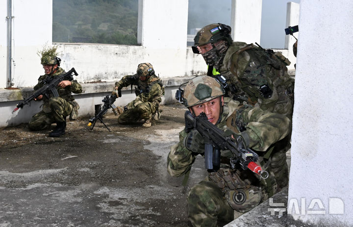 [인제=뉴시스] 사진공동취재단 = 25일 강원도 인제군 육군 과학화훈련단(KCTC) 도시지역훈련장에서 열린 제3회 국제 과학화전투 경연대회(K-ICTC)에서 다국적 연합군 장병들이 경계하고 있다. 2025.09.25. [email protected]