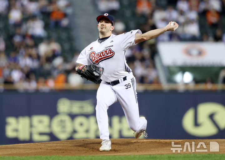 [서울=뉴시스] 조성우 기자 = 25일 오후 서울 송파구 잠실야구장에서 열린 2025 KBO리그 한화 이글스와 두산 베어스의 경기, 두산 선발투수 잭 로그가 역투하고 있다. 2025.09.25. [email protected]
