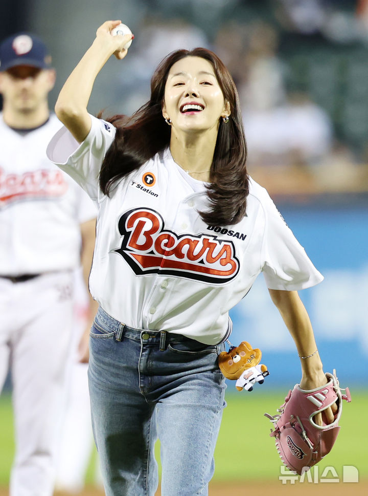 [서울=뉴시스] 조성우 기자 = 25일 오후 서울 송파구 잠실야구장에서 열린 2025 KBO리그 한화 이글스와 두산 베어스의 경기에 앞서 배우 소이현이 시구를 하고 있다. 2025.09.25. [email protected]