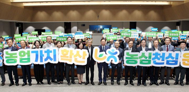 [서울=뉴시스] 25일 서대문구 서울본부 대강당에서 서울농협이 농심천심(農心天心)운동 발대식을 열고 서울농협 농심천심운동 홍보단 위촉 및 농산물 소비촉진 캠페인을 하고 있다. (사진=농협 제공) 2025.09.25. [email protected] *재판매 및 DB 금지
