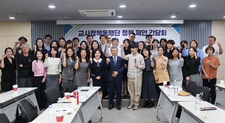 [서울=뉴시스] 최진석 기자 = 정근식 서울시교육감이 25일 오후 서울 서대문 바비엥교육센터에서 열린 교사정책동행단 정책 제안 간담회에 참석해 기념촬영하고 있다. (사진=서울시교육청 제공) 2025.09.25. [email protected] *재판매 및 DB 금지