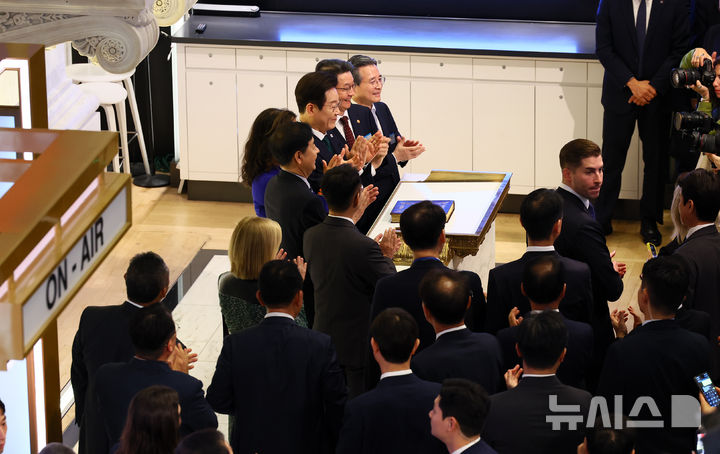 [뉴욕=뉴시스] 최동준 기자 = 이재명 대통령이 25일(현지 시간) 미국 뉴욕 증권거래소를 방문해 방명록을 작성한 뒤 박수치고 있다. 푸른색 옷은 뉴욕증권거래소 린 마틴 회장. 2025.09.25. [email protected]