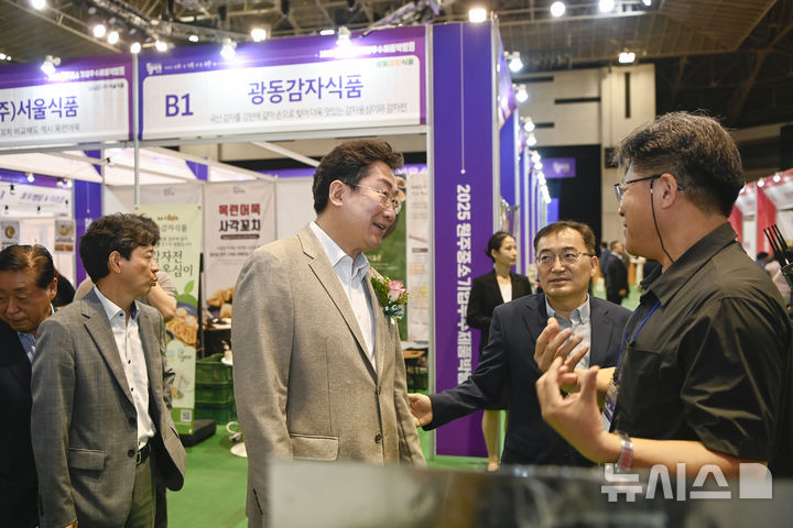 [원주=뉴시스] 이덕화 기자 = 26일 강원 원주시 치악체유관에서 '2025원주 중소기업 우수제품 박람회'가 열린 가운데 원강수 원주시장이 박람회 부스를 돌며 참여기업들을 격려하고 있다. 2025.09.26. [email protected]