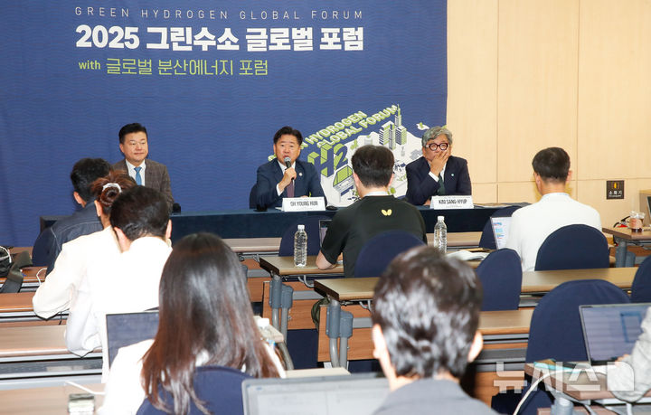 [서귀포=뉴시스] 우장호 기자 = 오영훈 제주지사가 26일 오전 제주 서귀포시 제주국제컨벤션센터에서 열린 '2025 그린수소 글로벌 포럼' 산업부 출입기자단 인터뷰에서 답변하고 있다. 2025.09.26. [email protected]