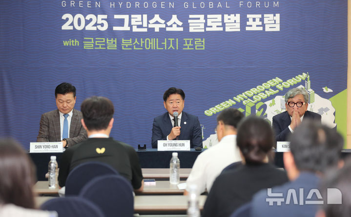 [서귀포=뉴시스] 우장호 기자 = 오영훈 제주지사가 26일 오전 제주 서귀포시 제주국제컨벤션센터에서 열린 '2025 그린수소 글로벌 포럼' 산업부 출입기자단 인터뷰에서 답변하고 있다. 2025.09.26. [email protected]