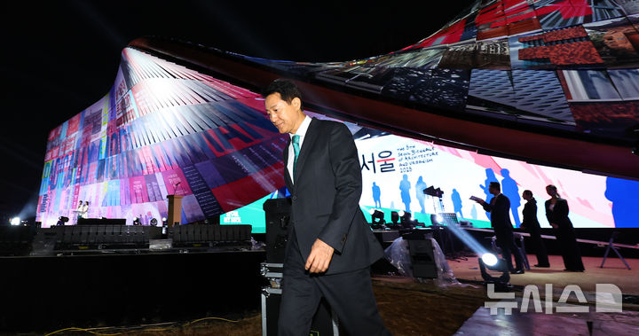 [서울=뉴시스] 최진석 기자 = 오세훈 서울시장이 26일 서울 종로구 열린송현 녹지광장에서 열린 '제5회 서울도시건축비엔날레 2025' 개막식에 참석해 인사말 뒤 자리로 이동하고 있다. 2025.09.26. [email protected]