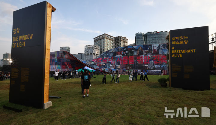 [서울=뉴시스] 최진석 기자 = 26일 서울 종로구 열린송현 녹지광장에 '제5회 서울도시건축비엔날레 2025' 주제전 대표작품인 휴머나이즈 월과 주제전 일상의 벽 출품작들이 보이고 있다. 2025.09.26. [email protected]