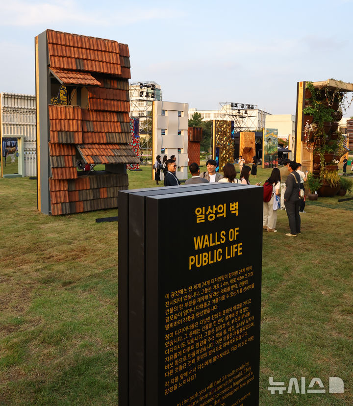 [서울=뉴시스] 최진석 기자 = 26일 서울 종로구 열린송현 녹지광장에 '제5회 서울도시건축비엔날레 2025' 주제전 일상의 벽 출품작들이 보이고 있다. 2025.09.26. [email protected]