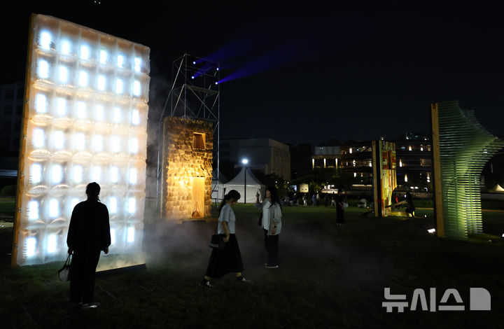[서울=뉴시스] 최진석 기자 = 26일 서울 종로구 열린송현 녹지광장에 '제5회 서울도시건축비엔날레 2025' 주제전 일상의 벽 출품작들이 보이고 있다. 2025.09.26. [email protected]