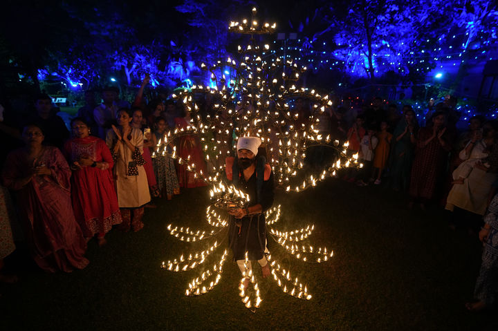 [아마다바드=AP/뉴시스] 26일(현지 시간) 인도 아마다바드에서 나브라트리 축제 닷새째를 맞아 기름등잔으로 장식된 의상을 입은 한 남성이 불로 축복을 구하는 아르티 의식을 행하고 있다. 여신 숭배 축제인 나브라트리 축제 동안 신도들은 두르가(용기의 여신), 락시미(부의 여신), 사라스와티(지혜의 여신)에 각각 3일씩 제사를 지낸다. 2025.09.27.