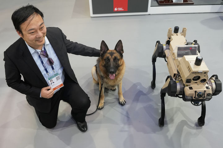 [베오그라드=AP/뉴시스] 26일(현지 시간) 세르비아 베오그라드에서 열린 방산 전시회에서 한 방문객이 세르비아 육군 탐지견, 정찰·공격용 사족보행 로봇과 함께 기념 촬영하고 있다. 2025.09.27.
