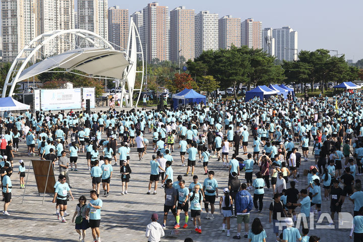 [인천=뉴시스] 박주성 기자 = 27일 인천 중구 씨사이드파크 하늘구름광장에서 열린 제1회 뉴시스 바다마라톤 대회에서 참가자들이 준비운동을 하고 있다. 2025.09.27. [email protected]