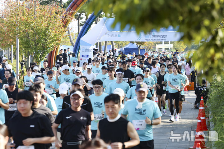 [인천=뉴시스] 조성우 기자 = 27일 인천 중구 씨사이드파크 하늘구름광장에서 열린 제1회 뉴시스 바다마라톤 대회에서 참가자들이 출발 하고 있다. 2025.09.27. [email protected]