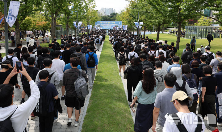 [서울=뉴시스] 이영환 기자 = 수험생들이 27일 서울 서대문구 연세대학교에서 열린 수시모집 논술 시험을 마친 후 학교 밖으로 나서고 있다. 2025.09.27. [email protected]