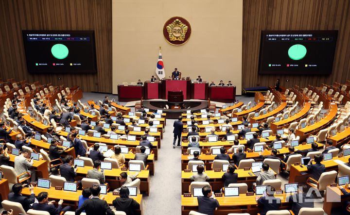 [서울=뉴시스] 조성봉 기자 = 27일 오후 서울 여의도 국회에서 열린 본회의에서 방송미디어통신위원회의 설치 및 운영에 관한 법률안(대안)이 재적 298인, 재석 177인 찬성176인 반대 1인으로 통과되고 있다. 2025.09.27. [email protected]