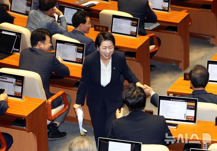 [서울=뉴시스] 조성봉 기자 = 황정아 더불어민주당 의원이 27일 오후 서울 여의도 국회에서 열린 본회의에서 방송미디어통신위원회의 설치 및 운영에 관한 법률안(대안)에 대한 찬성 무제한토론을 마치고 동료의원들에게 격려를 받고 있다. 2025.09.27. [email protected]