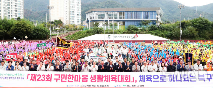 [울산=뉴시스] 배병수 기자 = 28일 울산 북구 농소운동장에서 제23회 북구 구민한마음 생활체육대회가 열린 가운데 김두겸 울산시장, 박천동 북구청장, 윤종오 국회의원, 김상태 북구의회 의장 및 구민들이 기념 촬영을 하고 있다.(사진=울산시 제공). [email protected].