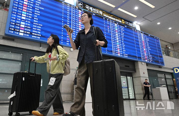 [인천공항=뉴시스] 박주성 기자 = 중국인 단체관광객에 대한 무비자 입국 시행 첫날인 29일 오전 인천국제공항 제1터미널 입국장으로 중국인 관광객이 입국하고 있다. (공동취재) 2025.09.29. [email protected]