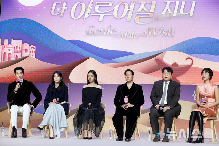 [서울=뉴시스] 김혜진 기자 = 배우 김우빈(왼쪽 첫번째)이 29일 오후 서울 강남구 조선 팰리스 서울에서 열린 넷플릭스 새 시리즈 '다 이루어질지니' 제작발표회에서 인사말을 하고 있다. 2025.09.29. [email protected]