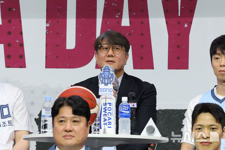 [서울=뉴시스] 배훈식 기자 = 손창환 고양 소노 감독이 29일 오후 서울 용산구 블루스퀘어에서 열린 2025-2026시즌 프로농구 개막 미디어 데이&팬 페스트에서 출사표를 밝히고 있다. 2025.09.29. [email protected]