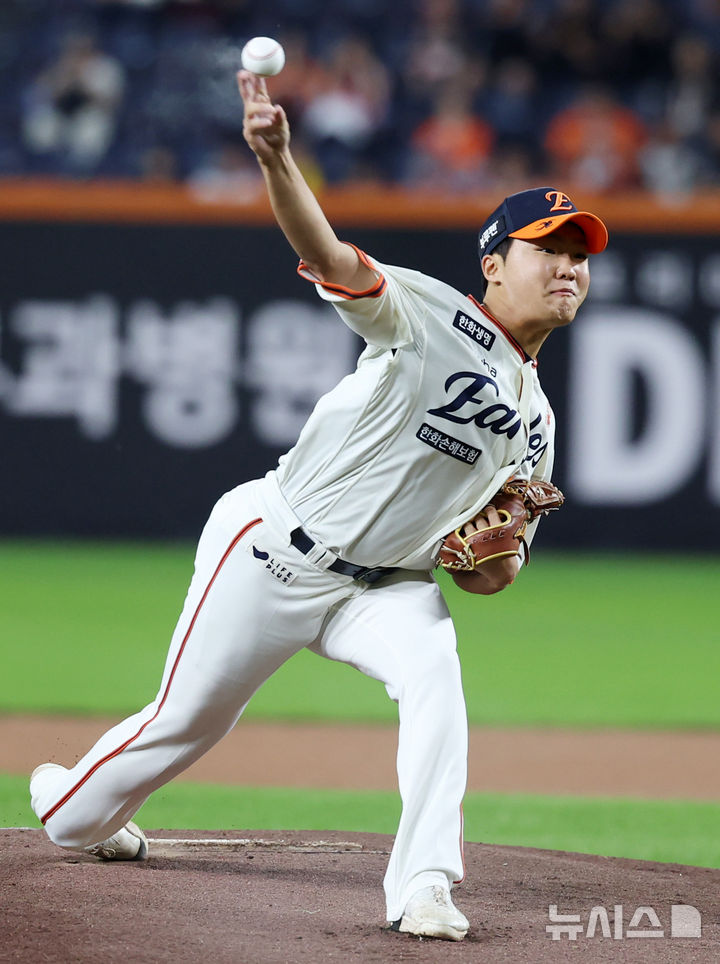 [대전=뉴시스] 조성우 기자 = 29일 대전 중구 한화생명볼파크에서 열린 2025 KBO리그 LG 트윈스와 한화 이글스의 경기, 한화 선발투수 정우주가 역투하고 있다. 2025.09.29. [email protected]