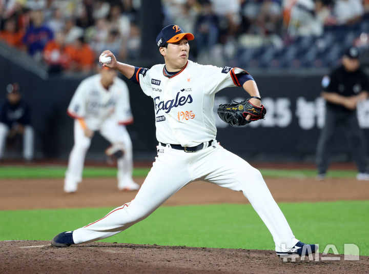 [대전=뉴시스] 조성우 기자 = 29일 대전 중구 한화생명볼파크에서 열린 2025 KBO리그 LG 트윈스와 한화 이글스의 경기, 한화 투수 박상원이 LG 7회초 공격 때 마운드에 올라 역투하고 있다. 2025.09.29. [email protected]