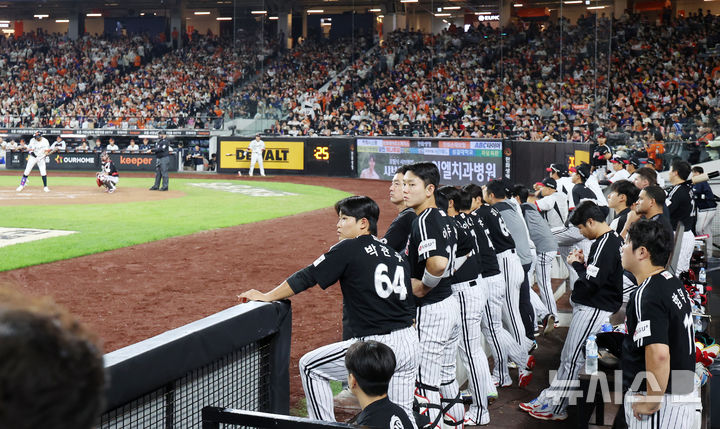 [대전=뉴시스] 조성우 기자 = 29일 대전 중구 한화생명볼파크에서 열린 2025 KBO리그 LG 트윈스와 한화 이글스의 경기, LG 선수들이 한화에 0-7로 뒤진 6회 경기를 지켜보고 있다. 2025.09.29. [email protected]