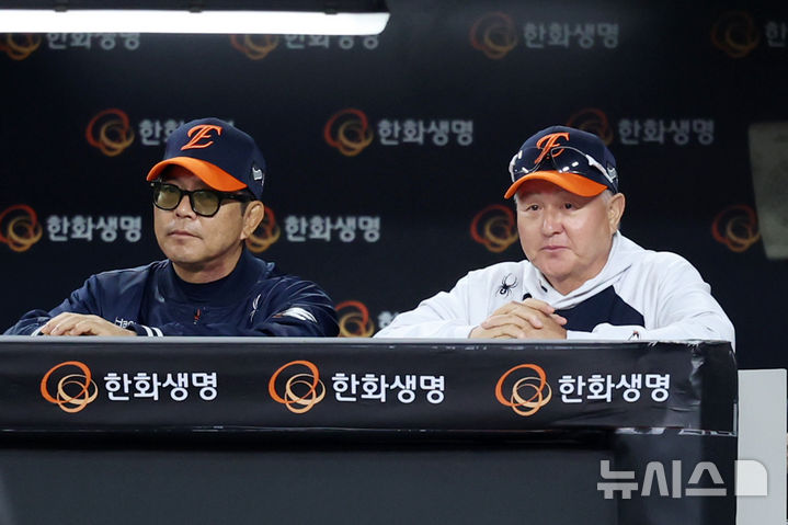 [대전=뉴시스] 조성우 기자 = 29일 대전 중구 한화생명볼파크에서 열린 2025 KBO리그 LG 트윈스와 한화 이글스의 경기, 한화 김경문(오른쪽) 감독과 양상문 투수코치가 LG 7-3으로 앞선 9회초 경기를 지켜보고 있다. 2025.09.29. [email protected]