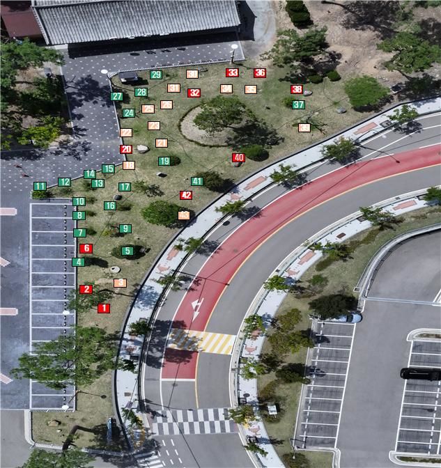 [영동=뉴시스] 충북 영동군이 30일 특정감사 결과를 발표하면서 공개한 레인보우힐링관광지 기증수목 위치·현황도. 기증받은 조경수 43그루 가운데 20그루(초록색 표시)는 생육중, 13그루(빨간색)는 고사(枯死), 10그루(노란색)는 행방이 묘연한 상태다. (사진=영동군 제공) 2025.09.30. [email protected]