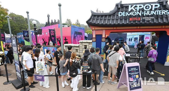 [용인=뉴시스] 김종택 기자 = 30일 경기 용인시 에버랜드에서 관람객들이 ‘케이팝 데몬 헌터스’(케데헌) 테마존 입장을 위해 줄 서 대기하고 있다.