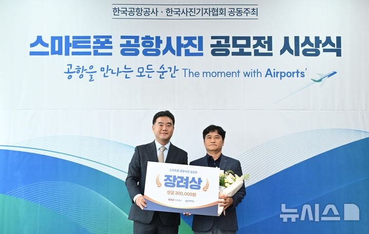 [서울=뉴시스] 공항사진기자단 = 이호재(왼쪽) 한국사진기자협회 회장과 장려상 수상자 원종식 씨가 30일 서울 강서구 한국공항공사에서 열린 한국공항공사 스마트폰 공항사진 공모전 시상식에서 기념촬영을 하고 있다.