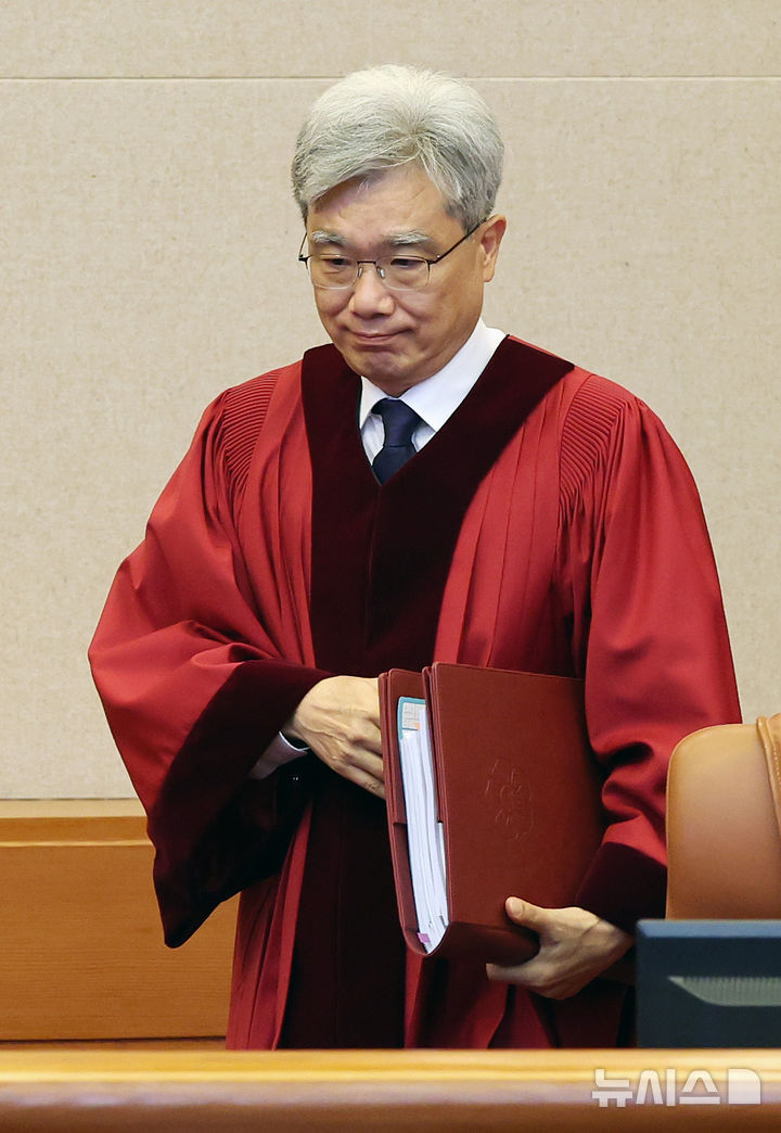 [서울=뉴시스] 조성우 기자 = 김상환 헌법재판소장이 30일 오후 서울 종로구 헌법재판소 대심판정에서 열린 조지호 경찰청장 탄핵심판 사건 2차 변론기일에 입장하고 있다. 2025.09.30. [email protected]