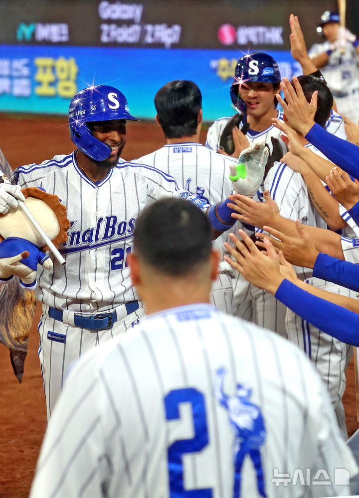 [대구=뉴시스] 이무열 기자 = 30일 대구 수성구 삼성라이온즈파크에서 열린 2025 신한 SOL 뱅크 KBO리그 KIA 타이거즈와 삼성 라이온즈의 경기, 1회말 1사 주자 1,3루 상황에서 삼성 다아즈가 스리런 홈런을 친 뒤 더그아웃에 들어서며 동료들과 기뻐하고 있다. 2025.09.30. [email protected]